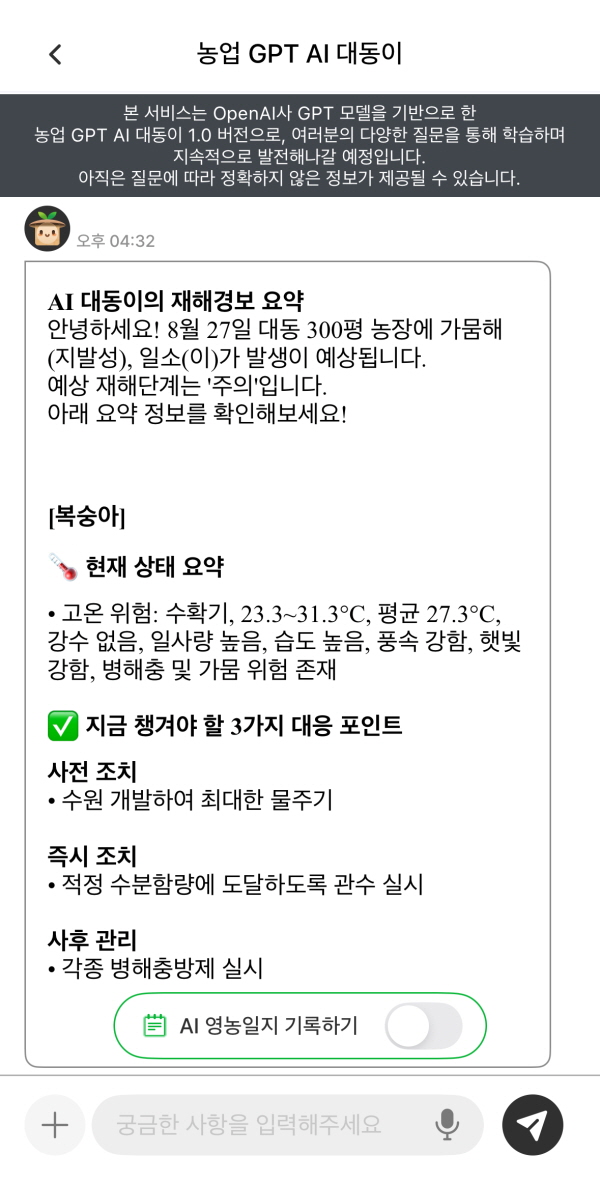 In addition, a disaster alert service developed with the Rural Development Administration has been added to the app. Using a 30-meter grid forecasting model - significantly more precise than the 5-kilometer grid used by the Korea Meteorological Administration - the service can predict major weather events such as heavy rain, snow, or drought up to ten days in advance. Through the Connect app, users can monitor real-time disaster information and receive step-by-step farming guidance from AI Daedongi before, during, and after extreme weather conditions. This helps farmers manage crop growth and minimize potential losses more effectively.